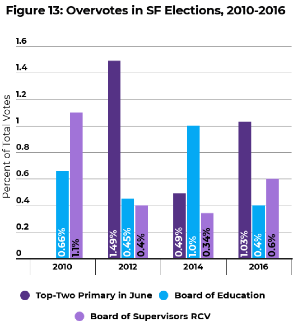 According to the study, San Francisco’s Board of Supervisors elections, which use RCV, actually had less over-votes than the Top-Two Primary system in three consecutive elections.