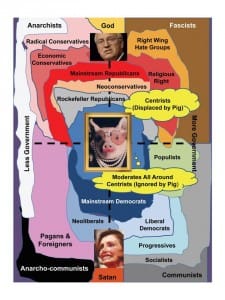 This is an element that requires further deliberation and adjustments in how we vote. This is very complicated. A major part of the problem in the past has been the result of the two-party tyranny displacing the center and making it impossible for the diversity of voices across America to be heard. In the graphic here to the right, created, with permission, on the basis of a simpler depiction in Michael Crane, The Political Junkie Handbook: A Definitive Reference Book on Politics (SPI Books, 2004).