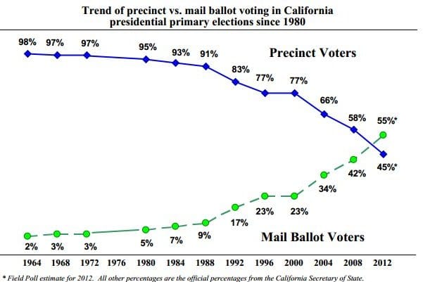 Field Poll out today says turnout in California’s first open primary today will be “the lowest ever recorded in the modern era” with just 35% of eligible voters participating. A record high 55% of votes cast will be done by mail rather than at a precinct voting booth. California allows votes to be cast by mail without restriction and the percentage doing so has grown steadily since the 1970’s. This election marks a milestone: for the first time those voting by mail will outnumber traditional voters.