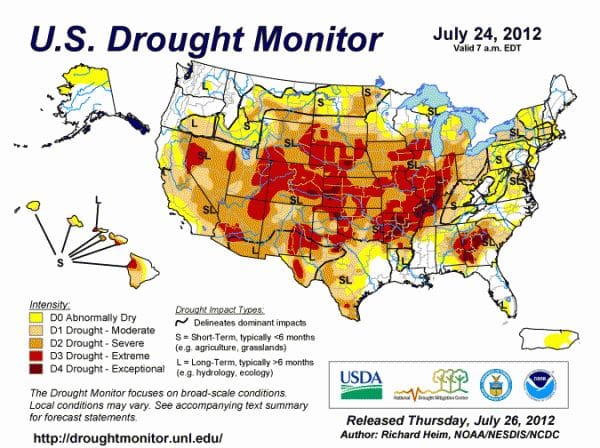 The drought that has been plaguing vast areas of the nation this summer, has intensified dramatically over the past week according to the U.S. Drought Monitor. The unrelenting heat and dryness of the regions most severely affected has caused the increased drought conditions stretching across 29 states. Drought Monitor author, Brian Fuchs, stated that the recent jump is the highest ever recorded since the inception of the nation’s drought monitor.