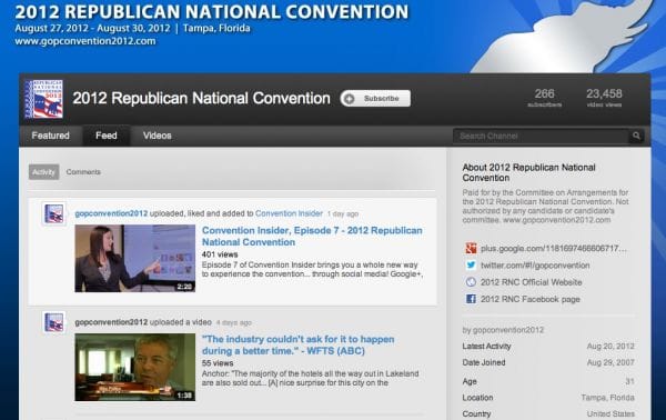 With already 20 videos and roughly 24,000 views on the RNC's page, the directing of traffic to their YouTube account will undoubtedly create a spike in activity in the coming weeks. Key playlists to keep an eye on are the "In Case You Missed It" and "Convention Insider" playlists.