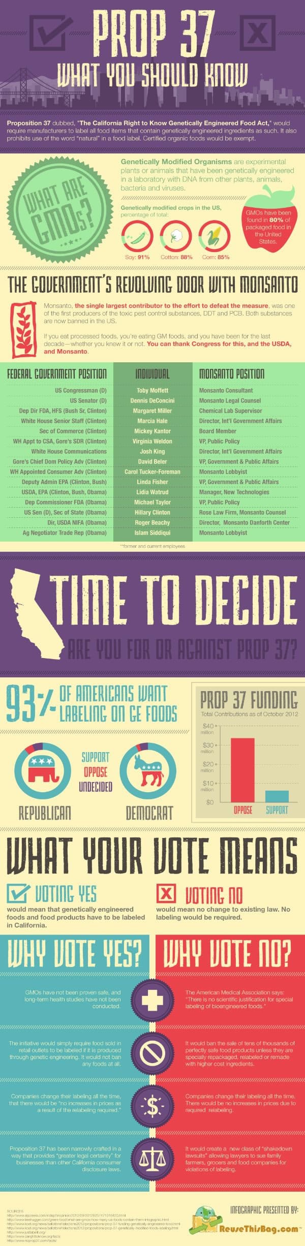 The following infographic, provided by Reusethisbag.com, highlights the pros and cons of voting for prop 37 . Credit: http://www.reusethisbag.com/
