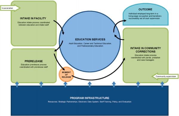 Adult education programs have until December 20 of this year to apply for PRESCEO grants. Grants are to be awarded in January 2013. The entire PRESCEO grant program can be read here. The updated Adult Reentry Model from the Department of Education can be read here. The Department also provides a graphic model of the plan: