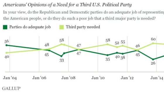 Respondents can answer “parties do an adequate job” or “third party needed.” The past several years has seen a rise in the number asking for political alternatives. While the number hit an all-time high in 2013, with 60 percent of Americans asking for a third choice around the government shutdown, the current number hovers around 58 percent of Americans.