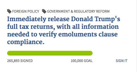 The White House petition has garnered nearly 270,000 signatures (as of the publication of this article). It says the returns need to verify that Trump is in compliance with the Emoluments Clause (or Title of Nobility Clause) of the U.S. Constitution.