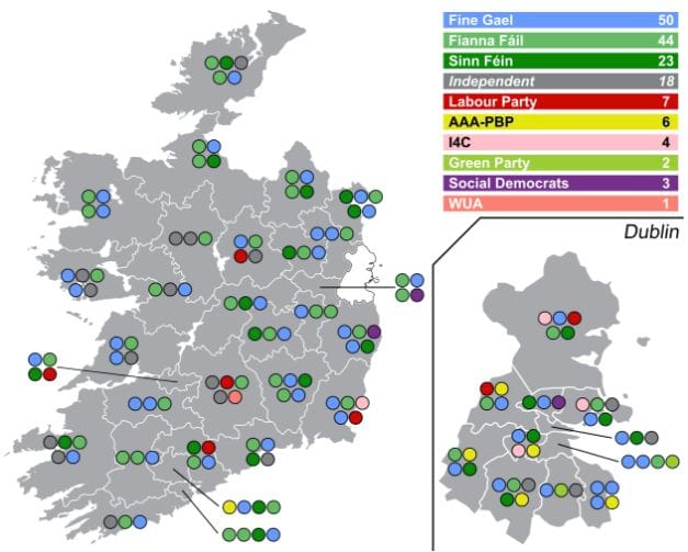 In fact, no district in Ireland has representatives from only one party; in many districts, every single representative is part of a different party. In some, you’ll have two or even three from the same party.