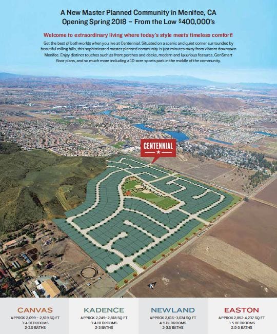 Located in Menifee, the Centennial development is a new master-planned community that placed a full-page color ad in the February 24th edition of the San Diego Union-Tribune.