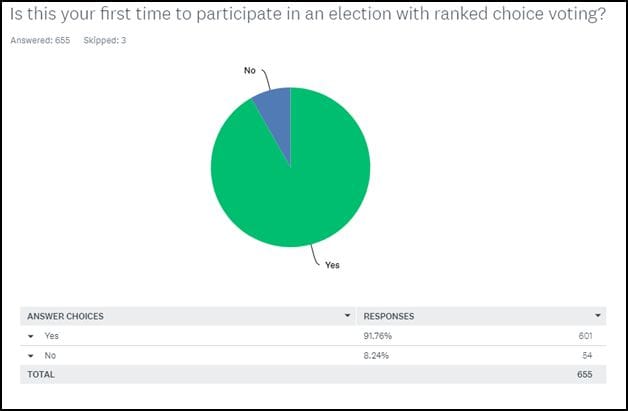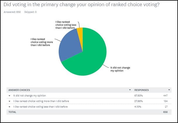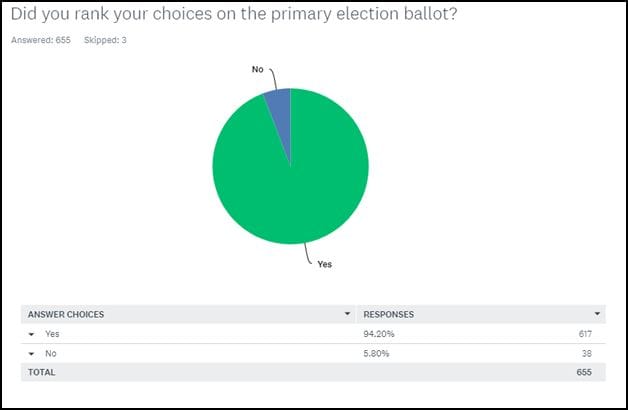 The informal survey does not purport to represent the views of the population as a whole but provides a useful snapshot of voter attitude coming out of the primary. The results and robust response rate -- over 650 participants -- reveal broad satisfaction with the use of RCV. Findings include: