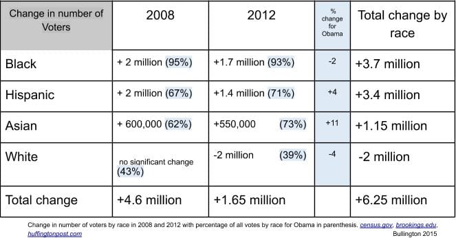 Is it a coincidence that in 2008 our first black president won by numbers roughly equal to the increase in minority votes minus the decrease in white voters? I argue not. It is not a coincidence that black Americans came out to champion President Obama -- it is identity politics. If it is a coincidence that white votes have decreased, it is at least symbolic of the very real racism embedded in our culture.