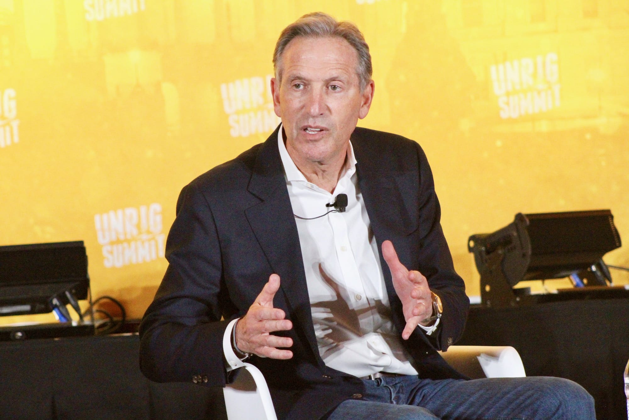While Ed Helms and Jennifer Lawrence kept the summit audiences laughing and smiling during the election reform panel and Unrigged Live, Howard Schultz brought a somber message of reflection about the crisis of character facing our country's politics today.