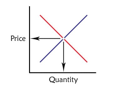 Suppliers can't sell more of a good than buyers are willing to buy and buyers can't buy more of a good than suppliers are willing to supply, so the point where the interests of all buyers and all suppliers in a market meet determines the quantity of goods produced and what the price of each unit of that good is. This is the place where the two lines intersect and it is called equilibrium. The total value of that market is the quantity of goods sold times the price of each individual unit, which is graphically represented by the square created by the two arrows and the two axes.