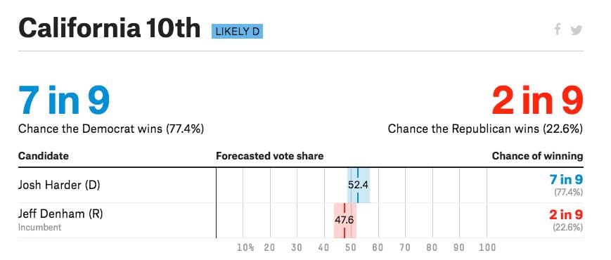 California's 10th Congressional District is considered a toss up in 2018. US Rep. Jeff Denham, a Republican, is defending his seat against Democrat Josh Harder. FiveThirtyEight is currently giving Harder a 77% chance of winning, but don't be surprised if the pollsters and statisticians get this race wrong.