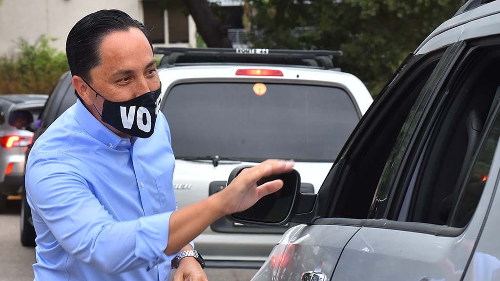 Under overcast skies before 8 a.m. Saturday, volunteers queued up at the United Labor Center in Mission Valley to pick up Todd Gloria campaign literature and lawn signs. Also goody bags with snacks and a mask.