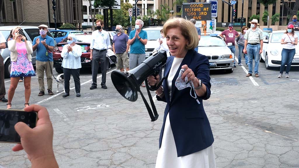 A couple hours later, green campaign signs and crepe paper were attached to cars in a downtown parking lot for a six-mile, 26-minute caravan in and around Balboa Park. Backers gathered in a circle to hear Barbara Bry give them a megaphone sendoff.