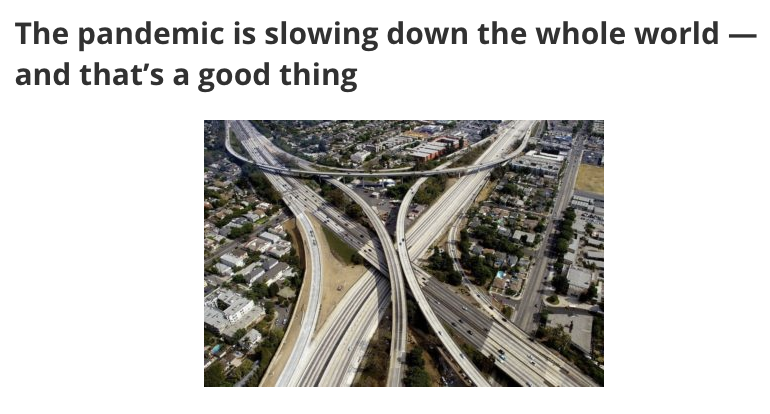 The Covid-19 news has been so continually grim, it’s brought us pain on many fronts including the loss of life, liberty, and meaningful human interaction, but maybe unexpectedly, the virus is also forcing us to radically examine our everyday lives, which will in turn, have lasting and important impacts on our communities far into the future.