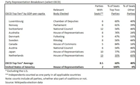 They would instead represent a third party, fourth party, etc., or independents. To reach the top OECD nations’ average, that number would be a whopping 172.