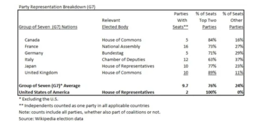 To put that in perspective, if the U.S. House of Representatives, which has 435 elected members, were on par with the other G7 countries, 104 of our congresspersons would be neither Democrat nor Republican.