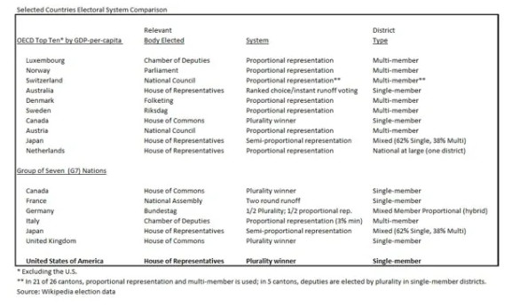- All of the countries with multi-member districts also have proportional representation (PR) in the math of their seat allocation—if a district with PR has ten seats and 30% of the voters choose a party or its candidates, that party’s candidates get three seats. Thus, unlike the US, minority factions in this example get representation if their votes reach approximately 10%.