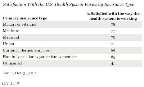 A recent Gallup study indicated that those with government insurance plans were the most satisfied with the way the health care system worked for them.