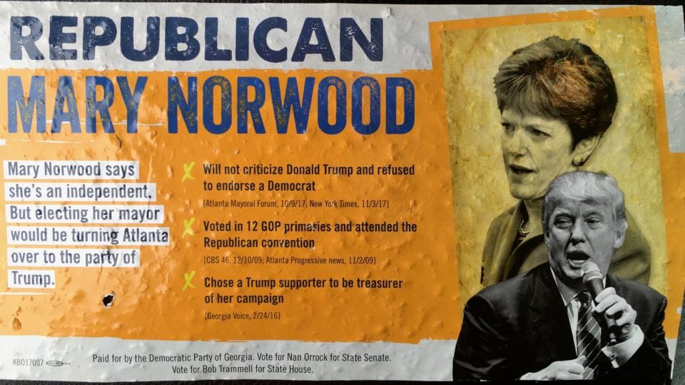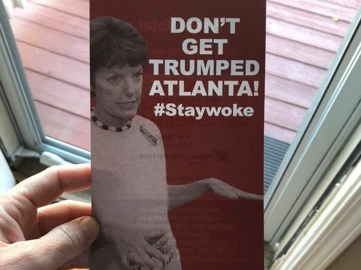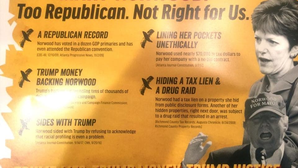A sampling of the literature pushed out by the Democratic Party of Georgia falsely attacking independent Mary Norwood as a Trump supporter.