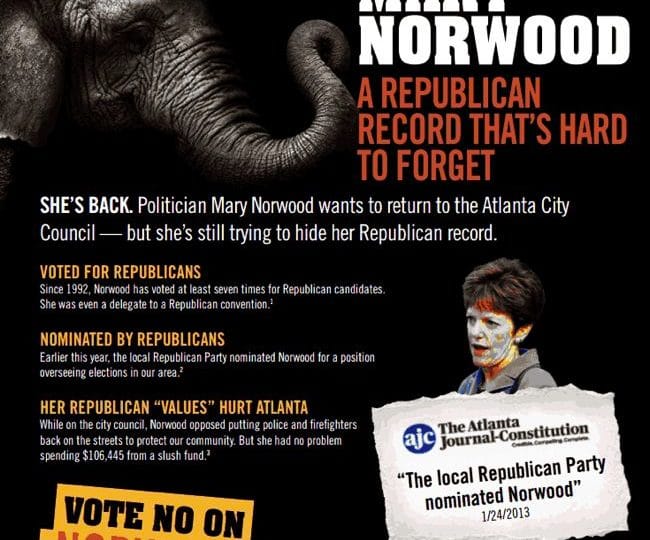With just the right amount of grease applied to its gears, Atlanta's partisan political machine reversed momentum in the race for mayor and defeated independent Councilor Mary Norwood by 759 votes out of more than 92,000 cast, according to the unofficial count.The winner, Democrat Keisha Lance Bottoms, is the hand-picked successor of outgoing Mayor Kasim Reed, whose administration is under FBI investigation. Bottoms defeated Norwood with the help of a last-minute infusion of cash, an estimated $200,000, from the Democratic Party of Georgia.The Democratic Party sent several mailings to predominantly African-American neighborhoods in Atlanta with literature claiming that Norwood is a Republican and a supporter of Donald Trump. Neither claim is accurate.