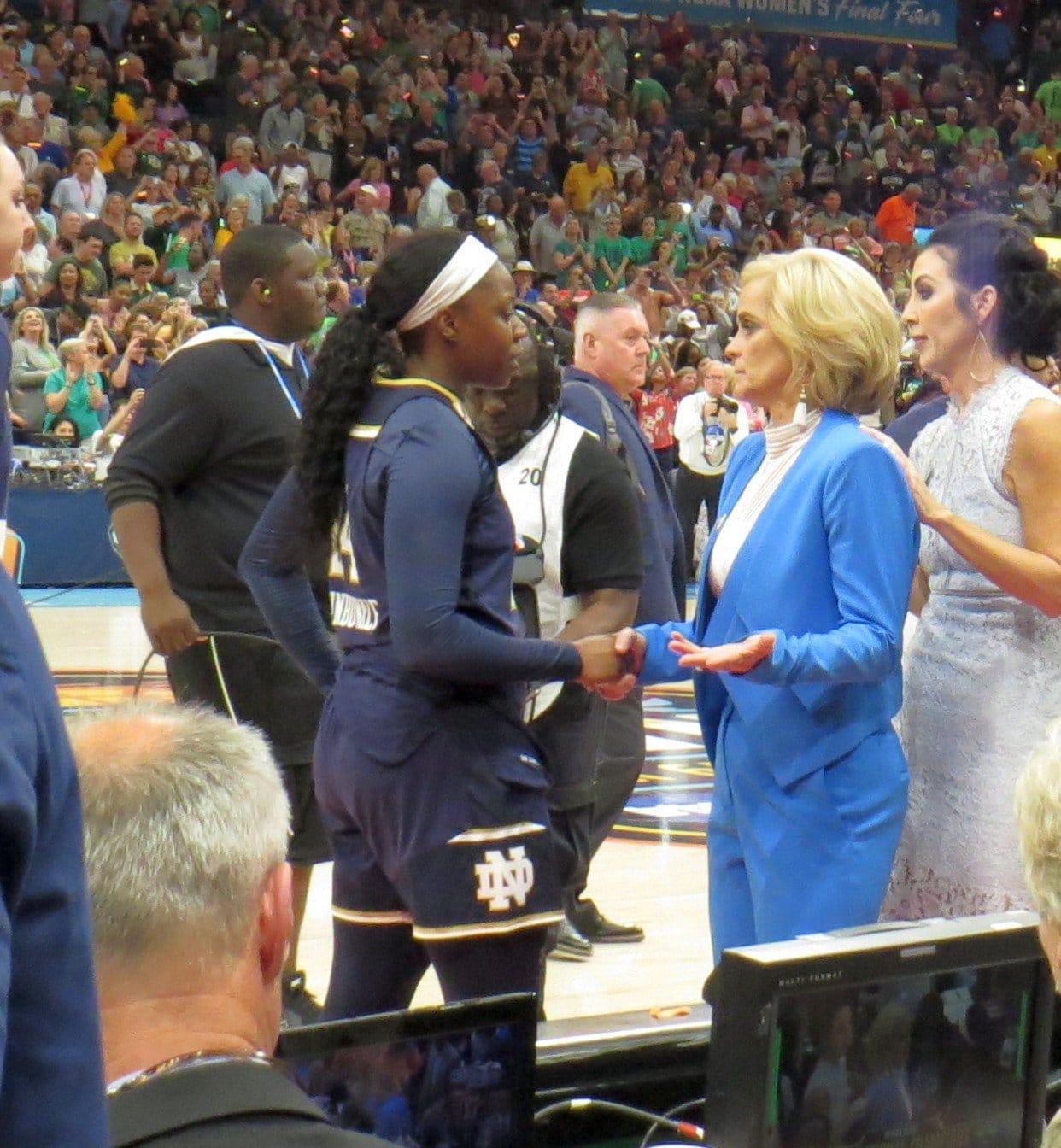 Kim Mulkey stopped when she got to Arike Ogunbowale, the dazzling Notre Dame guard who had won the championship for the Irish over UConn last year in the final seconds. Ogunbowale, having just missed a free throw that might have changed this year’s outcome, was despondent over the loss. Mulkey grabbed her fiercely and leaned in to say some words. You couldn’t hear them, but you could tell they were words of love and respect and demand. Arike held back the tears.