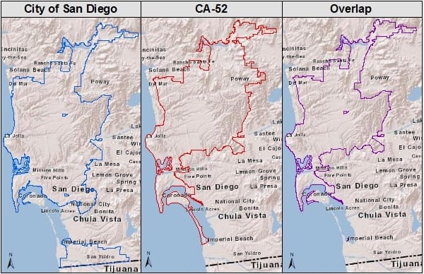 The maps below illustrate just how much the Congressional District coexists with the City of San Diego where voters will soon elect a new mayor. The charts illustrate just how many decline to state voters are in the Congressional District, within the city of San Diego and how many intersect.