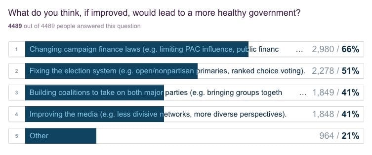 The Bridge Alliance, joined by six of its member organizations, launched a survey to help make sense of what Americans thought was needed to create a healthier political ecosystem. Nearly 4,500 participated in the survey.