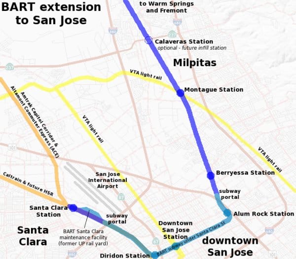 By 2016, if all goes as planned, an extension of the Bay Area Rapid Transit (BART) line will go from Fremont in the East Bay to the Berryessa area of San Jose. Construction will begin in April. The project will cost $2.3 billion with $900 million being a grant from the federal government. Among other things, this means people in San Jose will be able to get to San Francisco Airport (SFO) on BART, even if the route is a bit circuitous. Further, those living in the East Bay will more easily be able to get to work in Silicon Valley.