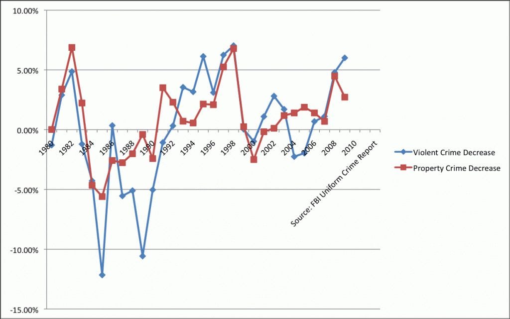 Despite the fact that crime continues to decrease, there isn’t any really good answer to explain the drop or what the cause may be. Conventional wisdom typically holds that the health of the economy and the level of unemployment serve as an accurate indicator of the level of crime. However, this continued decrease in crime we’re seeing is occurring in the midst of elongated economic turbulence and sky-high unemployment rates.