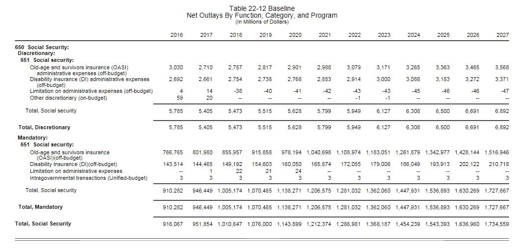 In this case, the 2016 "Infographic" above was dead on as far as mandatory spending.  According to this chart, Social Security spending will increase from $916 Billion in 2016 to $1.7 Trillion by 2027.