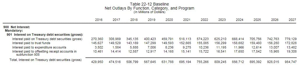 That number is actually $429 billion for 2016, when you include interest being taken from trust funds such as social security and a few other line items. In 2027, that figure will be $984 billion.