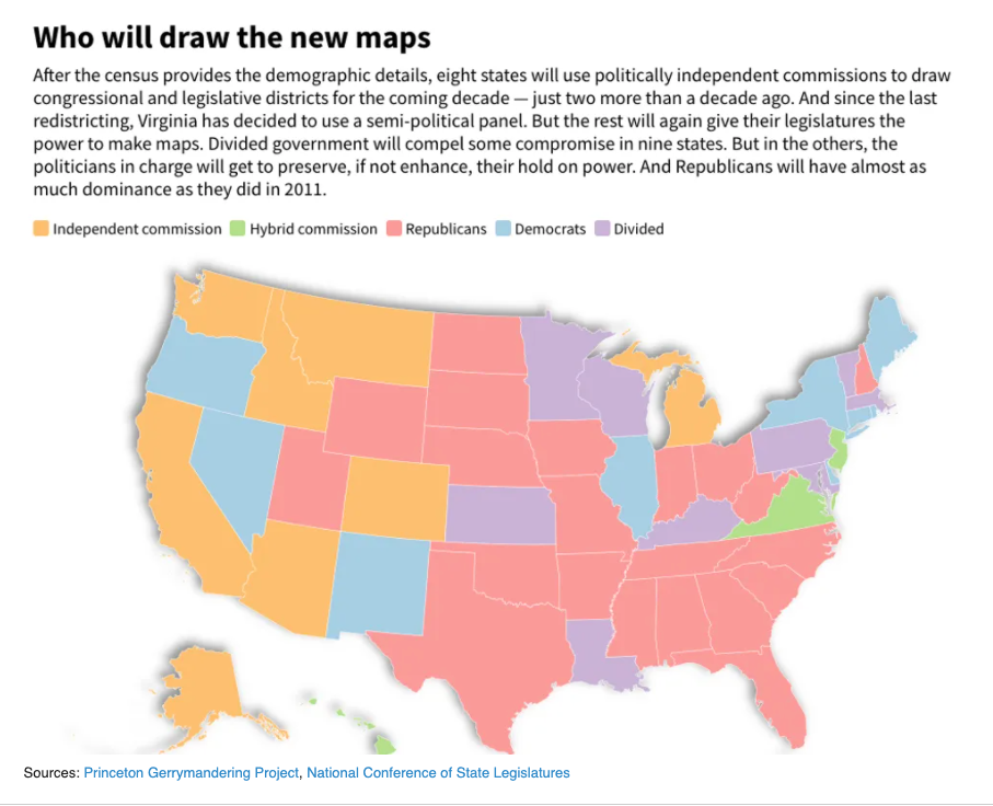 But the redistricting power will remain in the hands of elected politicians in more than three-quarters of the states. The GOP has secured the dominant advantage for a second straight decade because it has won unfettered control over the process in 21 states — Texas, Florida, Ohio and North Carolina among them — accounting for as many as 185 House seats, better than two out of every five, depending on precisely how reapportionment turns out.