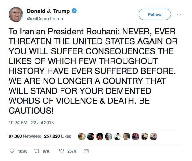 Western media outlets who reported on the warnings from Rouhani were all quick to note that as formulated, his words do leave open the possibility of peace between the government of Iran and that of the United States. Not to be outdone, Donald Trump took to his Twitter account to fire back at the Iranian president: