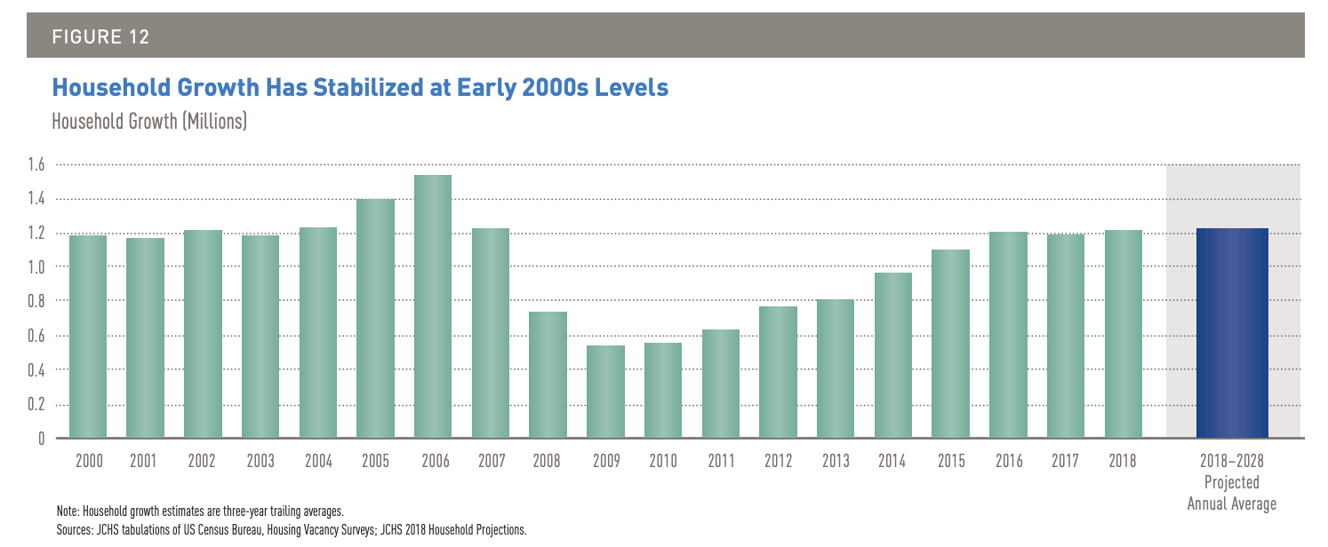 We agree the 2010 headship rate might have been affected by the Great Recession, but the Harvard report suggests that household growth is now stabilizing at early 2000 levels (see below). So perhaps 2000 is not an unreasonable benchmark. The DOF did not publish their actual headship rates. They just noted the adjustment had been made with overcrowding and cost-burdening in mind. We will certainly be looking at other models in our next newsletter - including one that uses historical benchmarks 1970 to 2000. We’ll see how they compare.