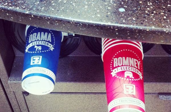 However, Pacific Magazine associate editor Allie Daugherty pointed to a much less scientific poll, the 7-Eleven cups. The convenience store gives coffee drinkers the option to choose between a Romney or Obama cup and they keep track of how many of each they sell, state by state.