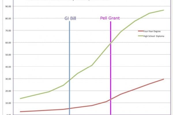 One of the great accomplishments of the United States in the 20th century was the raising of the college graduation rate from about 3% when the century began to around 25% when it ended. As a result, at the end of the 20th century, the United States had the finest higher education system in the world. This was not, however, due to steady or consistent growth over time. It was the result of two very specific federal programs that did exactly what they were designed to do: