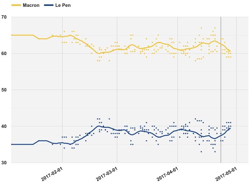 Unlike Trump, however, Le Pen is unlikely to do as well for several reasons. For one, Le Pen has just two weeks between rounds to catch up from a 20-point polling deficit. Macron doesn't have the within-party division that Clinton experienced after turning off Sanders supporters, so there’s less risk of him losing those voters in the second round. And with just two candidates, there’s no one else to lose votes to. Finally, Macron doesn’t have to deal with any French equivalent of the Electoral College wild card. Therefore, it seems that—minus some large revelation—Macron should beat Le Pen in the runoff quite easily.