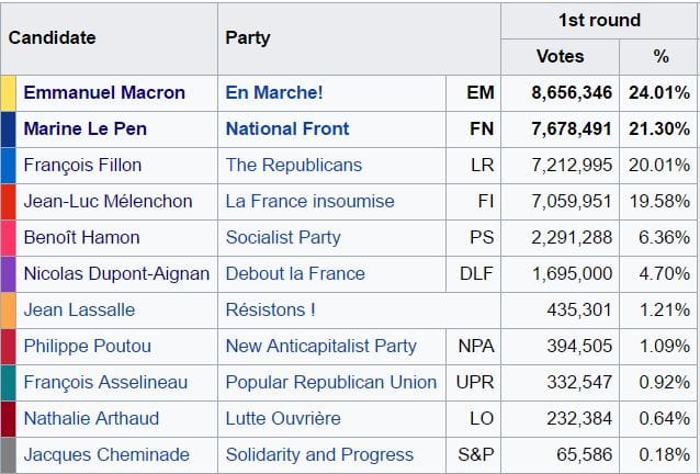 Interestingly, parties can enter into alliances where one party decides not to run a candidate. Two parties took this approach this time. Candidate Bayrou from the Democratic Movement Party made an alliance with the similarly centrist En Marche! Party founder, Emmanuel Macron. The French equivalent of the Green Party made their alliance with Socialist Party candidate Benoît Hamon.
