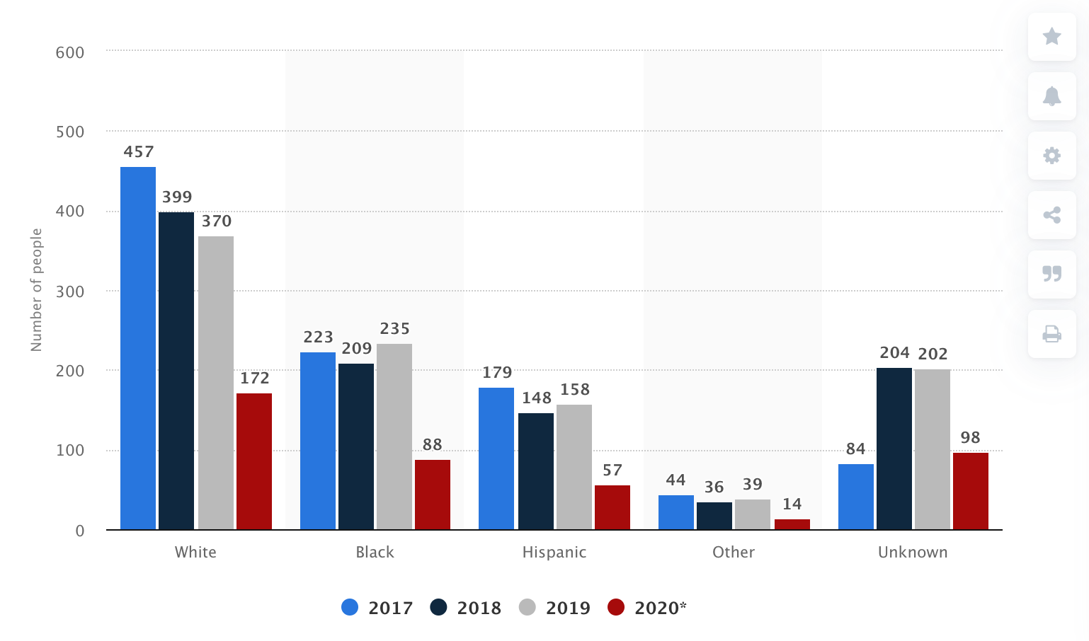 But being black in America is not a death sentence. In 2019, the US Census Bureau estimates there were 43,984,096 black lives in the United States. Almost none of them were killed by the police. In 2019, police fatally shot 235 black people. They fatally shot 370 white people.