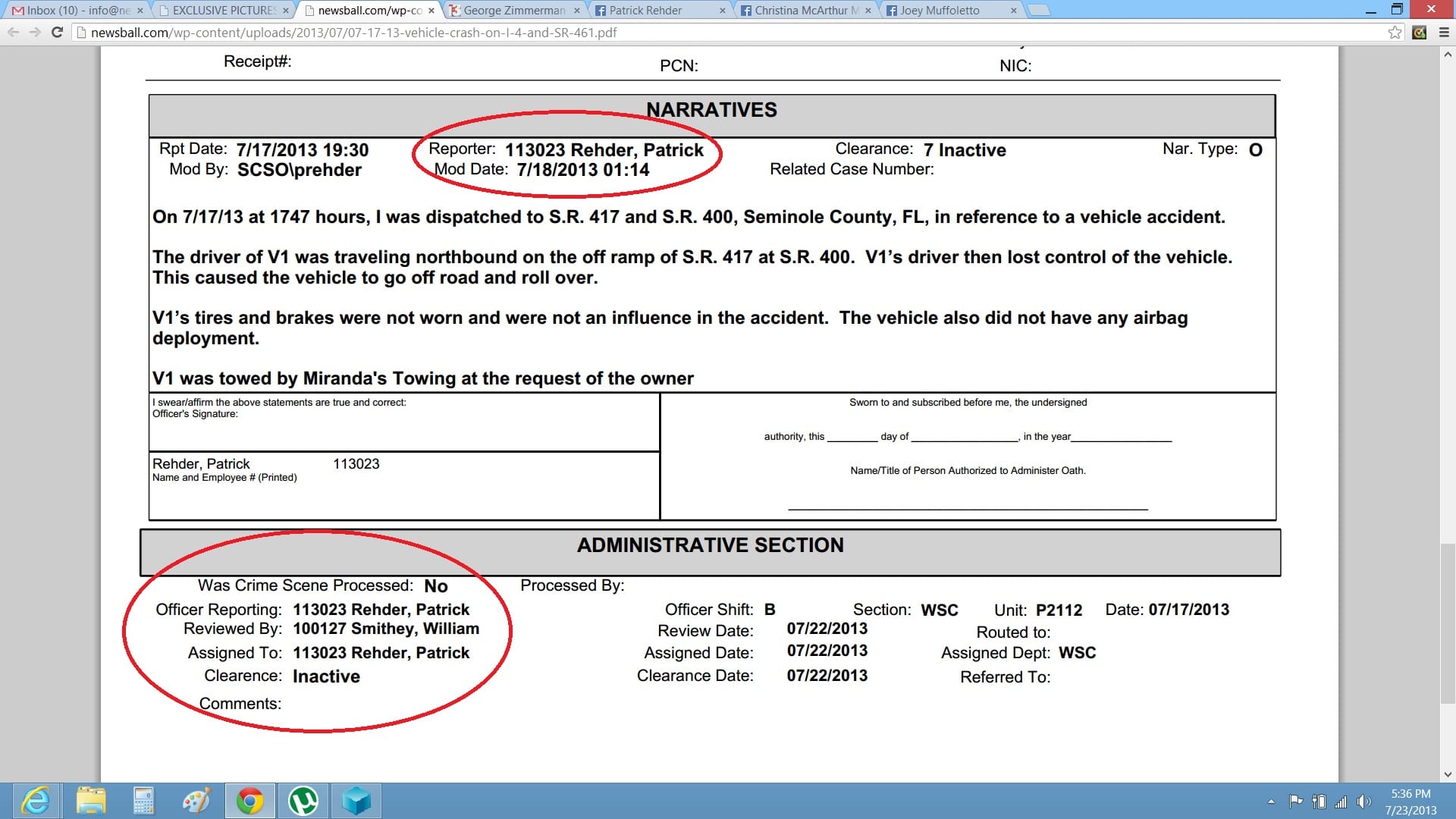 Rehder's name appears on the accident report as the responding officer; social media shows his connection to Zimmerman.