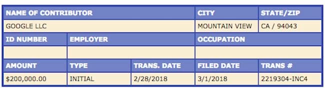 Facebook had donated $200,000, but following Mark Zuckerberg's testimony before Congress, pulled that money and has stated they will not be funding opposition to CCPA.