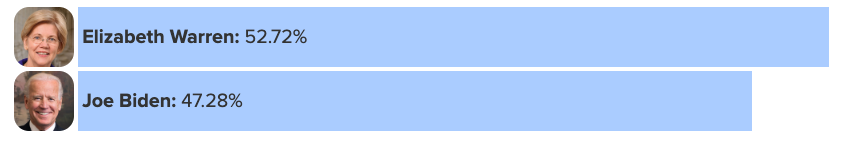 - She beats Biden in a head-to-head contest, 53% to 47%. She is also better positioned to beat Biden in a head-to-head contest compared to other Democratic candidates, including Bernie Sanders (who Biden beats with 57% support), Kamala Harris (Biden takes 60%), and Pete Buttigieg (Biden takes 63%).