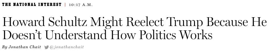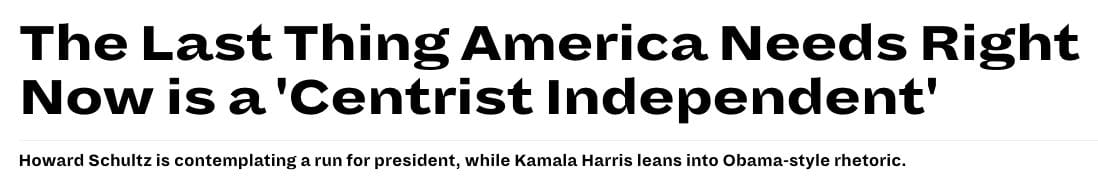 The last headline is important to note. Not because of the article itself, which is a lengthy love letter to Kamala Harris, but because of the term "centrist independent." It is a label that Schultz embraces, but he doesn't know just how big a mistake this could be.