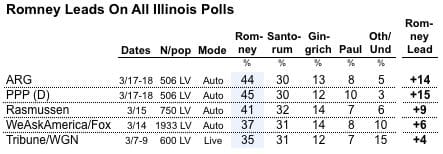 Going into today's primary, Mitt Romney holds a commanding lead in all Illinois polls, aggregated by the Huffington Post, with Public Policy Polling placing him 15 percentage points ahead of his main opponent in today's primary: Rick Santorum.