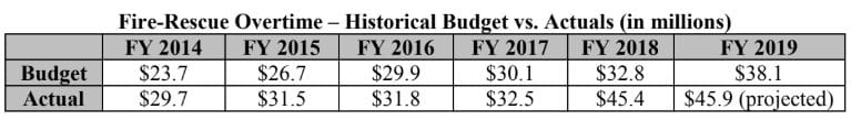 The report states that for fiscal year 2018, the fire-rescue department was $12.6 million over budget, a dramatic jump from 2017, when it was $2.4 million over budget.