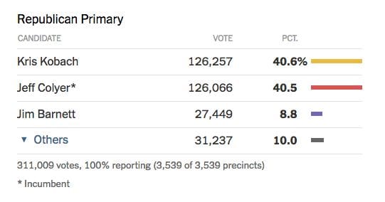 Kobach's lead over Colyer has narrowed to a mere 91 votes.