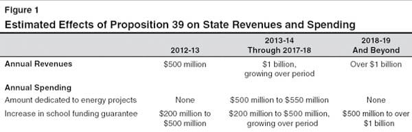 Although the assertion that Proposition 39 will create 40,000 jobs is somewhat nebulous, the Legislative Analyst Office findings on Proposition 39 show an increase in state revenues by almost $1 billion into 2019. Also, it will provide additional funds for California schools and, beginning in 2013, allocate funds for green energy projects inside the state exclusively.