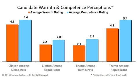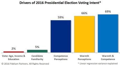 For instance, our September 2016 study of over 1,000 US adults showed that nearly 70% of willingness to vote for either Clinton or Trump was driven by their general perceptions of each candidate's "warmth" and "competence."
