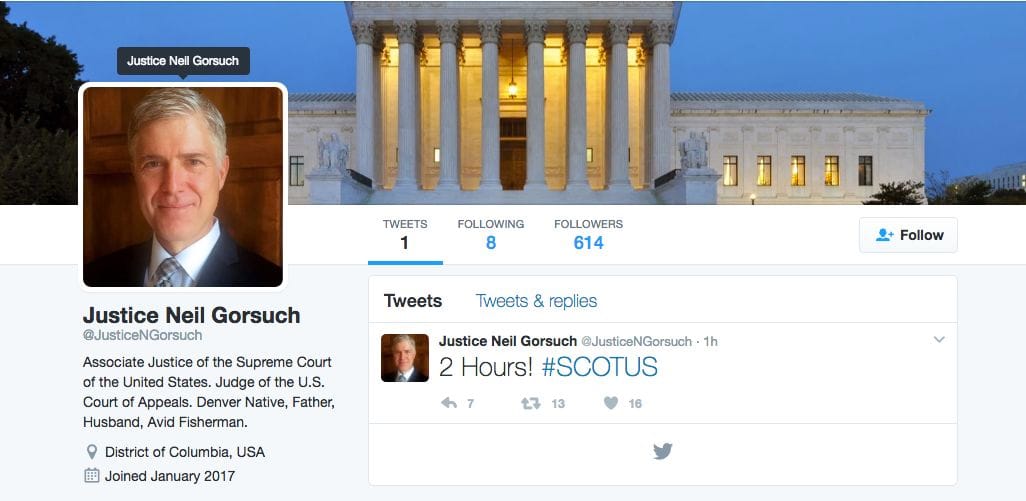 For those keeping an eye on Twitter, a new account was created with Gorsuch's name hours ahead of the announcement with the handle, @JusticeNGorsuch. Who created it has not been verified as the account calls him an "Associate Justice of the Supreme Court" before he has even been given a confirmation hearing.